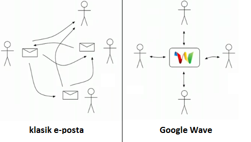 İlk bakışta bir e-posta hizmetine benzese de (ilk soruyu hatırlayın), Google Wave’de birçok farklılık mevcut. Örneğin kullanıcıdan kullanıcıya iletilen mesajlar yerine, mesajları tek bir yerde toplayıp buradan ulaşmak yepyeni bir fikir.